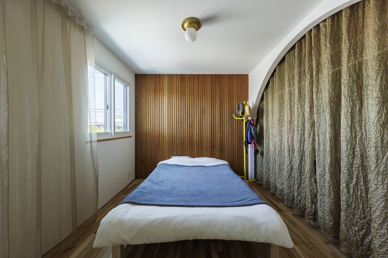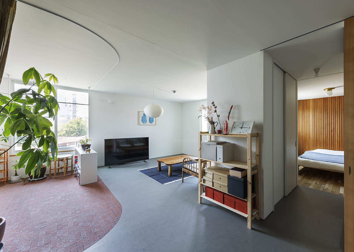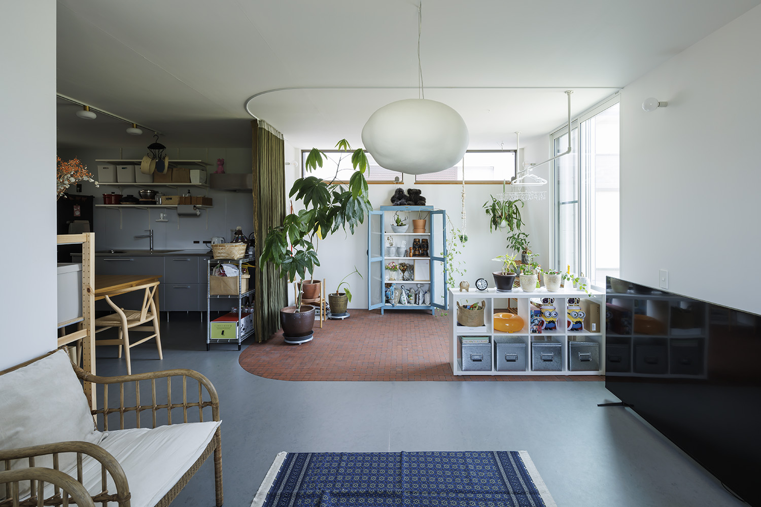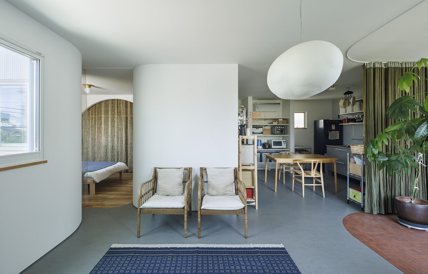 2Fは、部屋を建具で細かく分けるのではなく、壁のアールや床の素材を変化させることでやわらかく仕切っています。