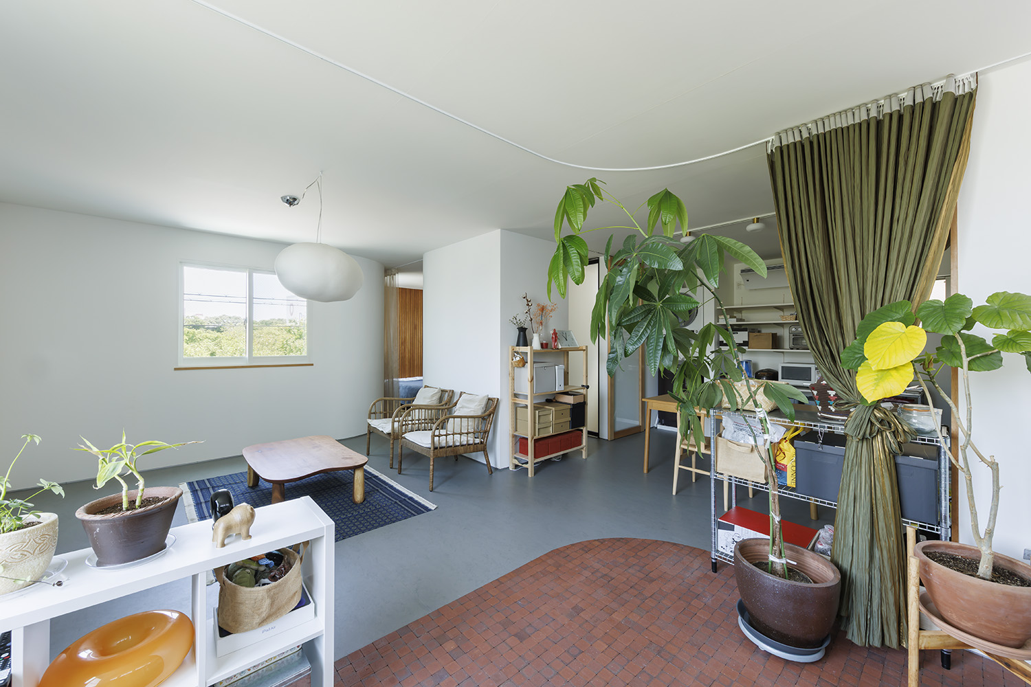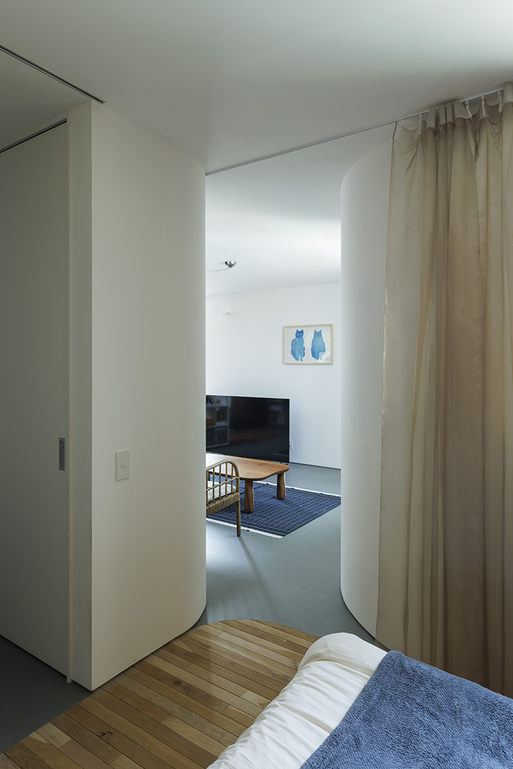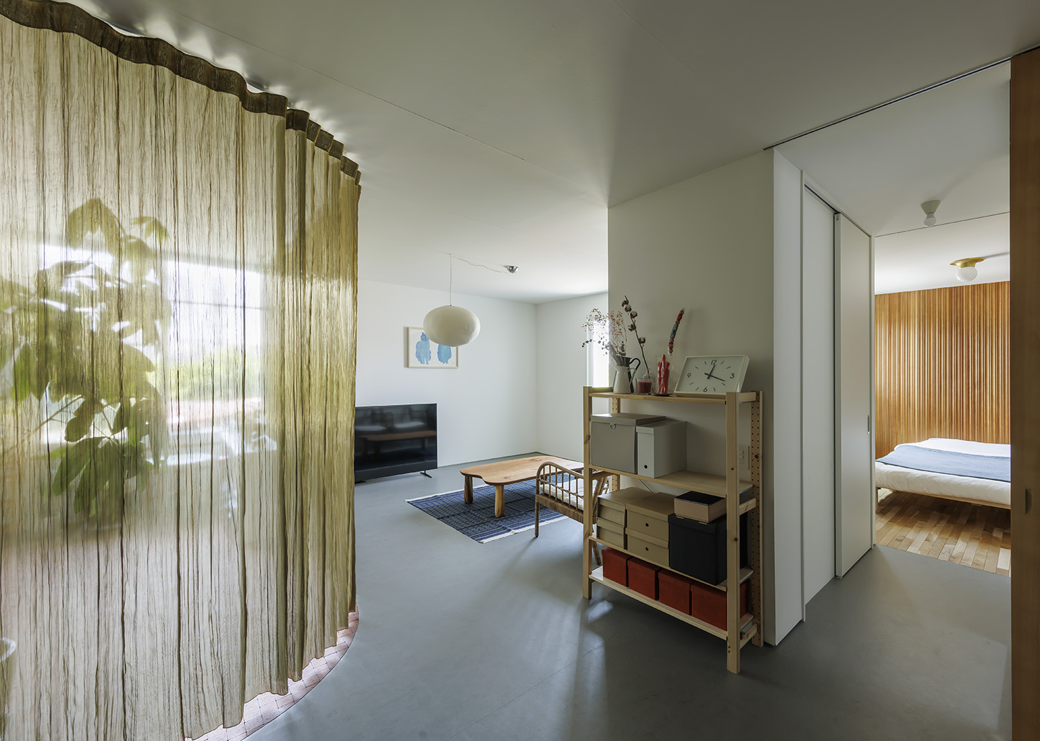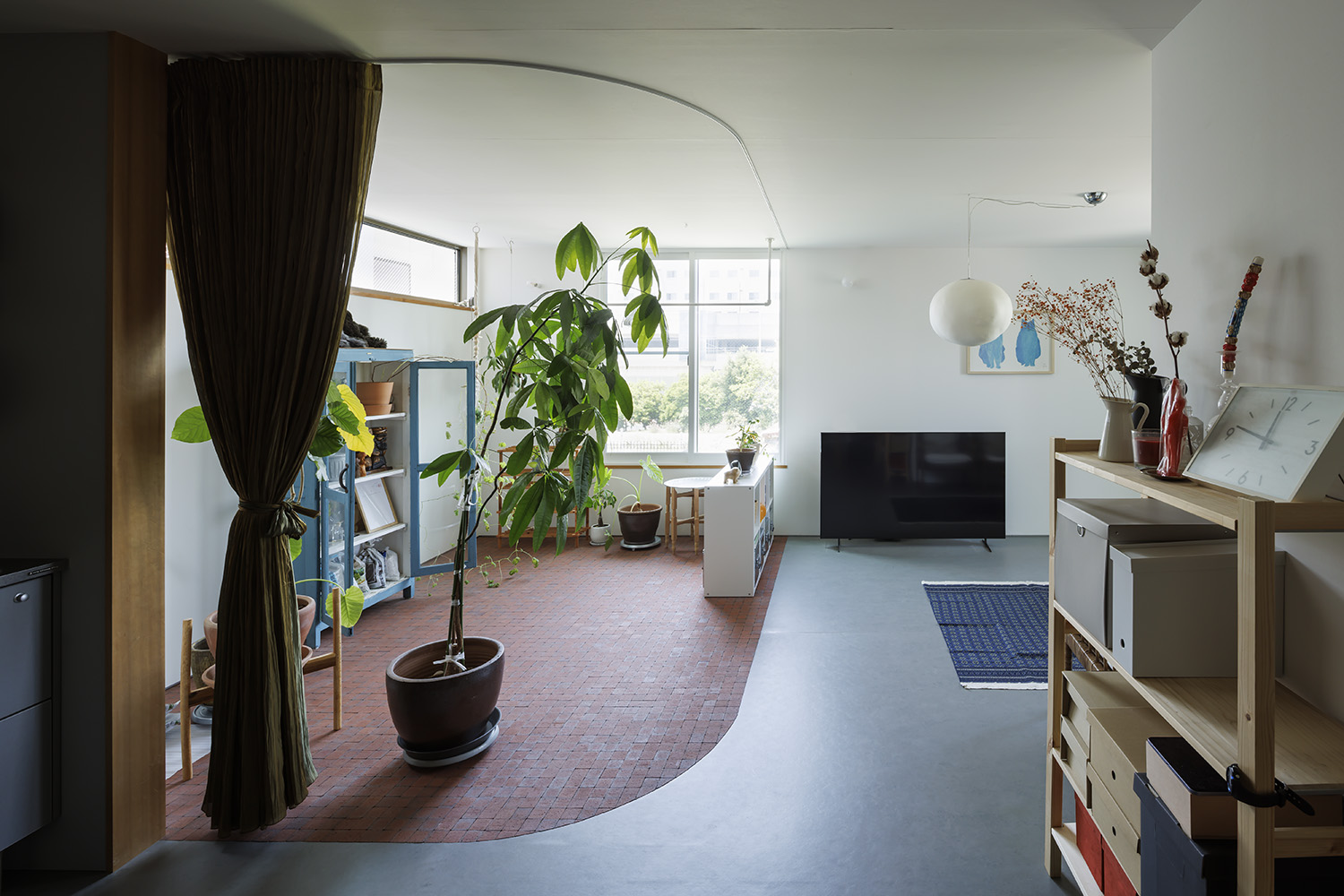 2Fは、部屋を建具で細かく分けるのではなく、壁のアールや床の素材を変化させることでやわらかく仕切っています。