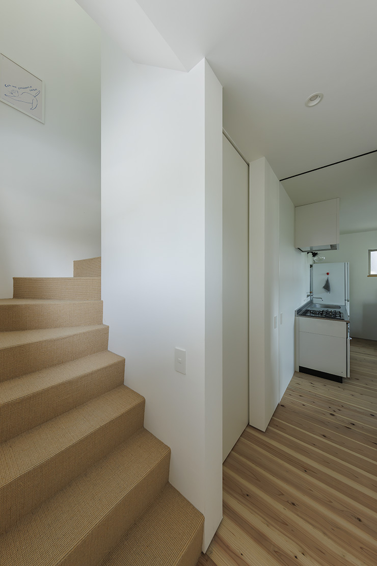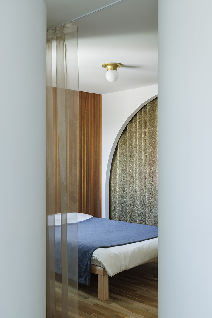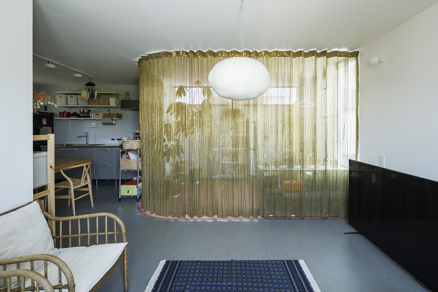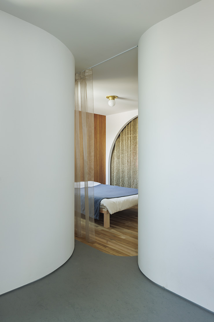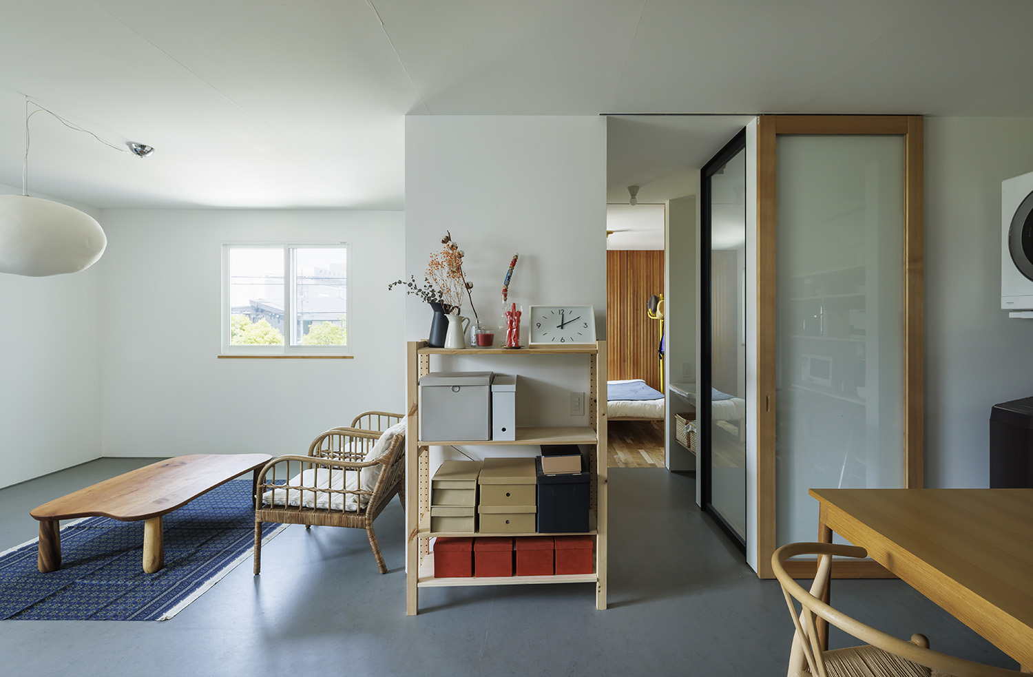 2Fは、部屋を建具で細かく分けるのではなく、壁のアールや床の素材を変化させることでやわらかく仕切っています。